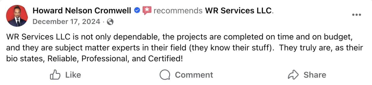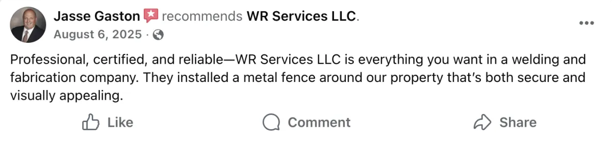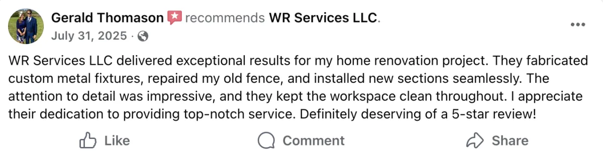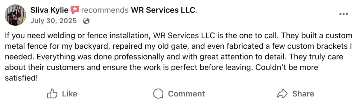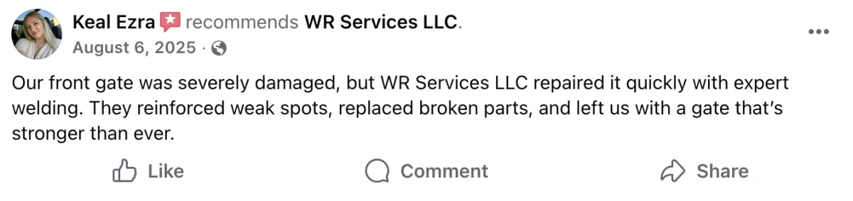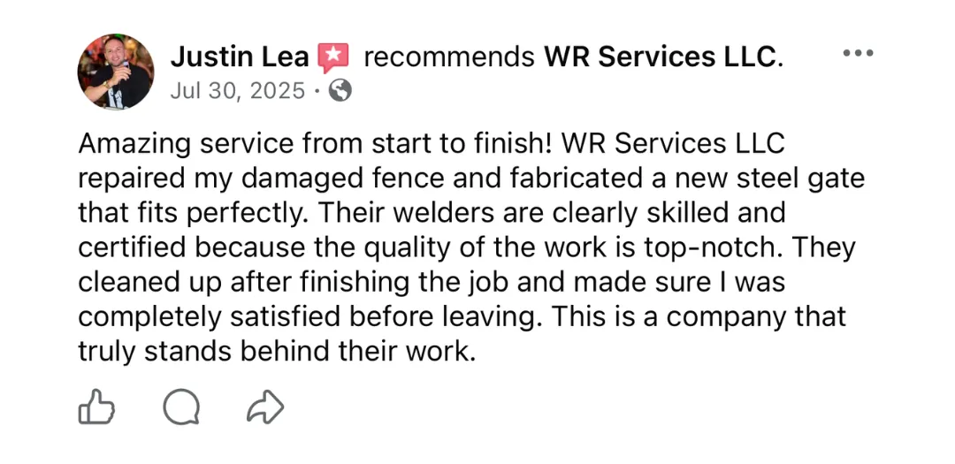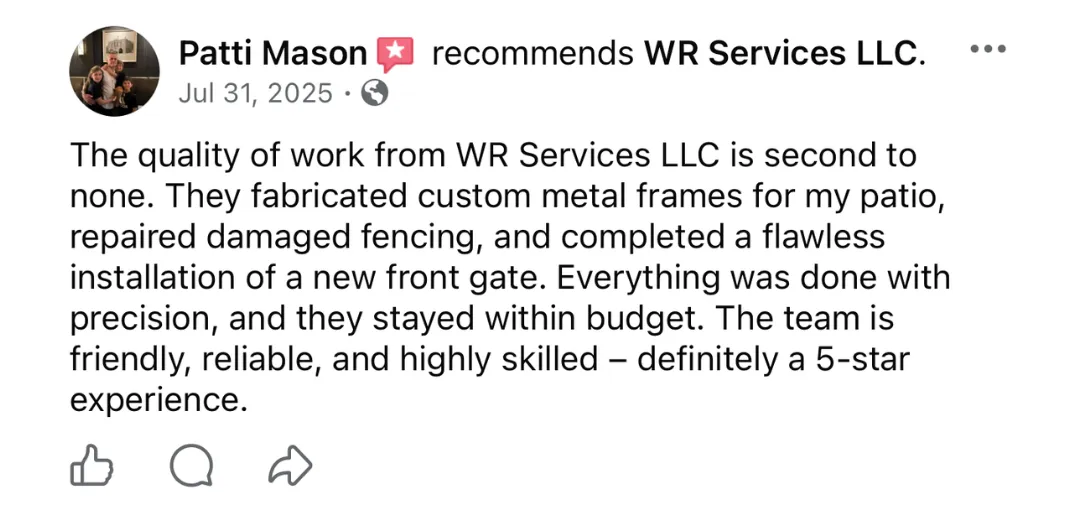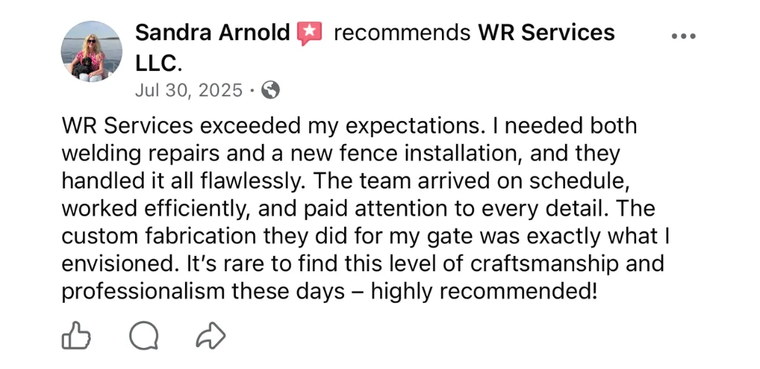 At WR Services, we've been installing fences across Baltimore County for 20 years. Whether you want vinyl, wood, aluminum, chain-link, or custom ornamental ironwork, the difference between a fence that looks amazing and one that fails comes down to proper installation. We go below the frost line, use commercial-grade materials, and combine welding and fabrication expertise to handle custom gates, railings, and decorative work that most fence contractors can't touch. Serving Baltimore City, Baltimore County, Prince George County, Aberdeen, Bel Air, Edgewood, Joppatowne, and White Marsh. Professional installation that still looks sharp years later.